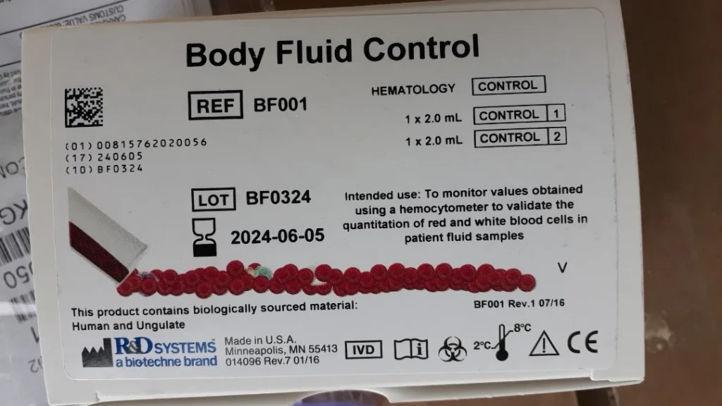 Body Fluid là bộ kiểm chuẩn 2 mức (bi-level control) dùng để theo dõi tổng số lượng tế bào được thực hiện thủ công bằng buồng đếm hemocytometer. Hai mức kiểm chuẩn được thiết kế để kiểm soát giá trị trong vùng bình thường và bất thường.